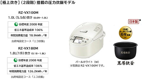 【仕様】 タイプ 圧力IHタイプ 型式 RZ-VX100M RZ-VX180M 本体色 パールホワイト(W) 炊飯容量 1.0L(5.5合) 1.8L(1升) 0.09〜1.0L 0.18〜1.8L 圧力スチーム炊き ー 圧力 最高1.3気圧 スチーム ー 高温浸し ● 全周断熱構造 ー 側面ヒーター 35W 40W 内釜 最厚部2.3mm 水位線 水位線 炊飯コース 出荷時設定コース エコ炊飯 極上炊き(白米) しゃっきり/もちもち(食感を選択可能) 極上炊き(玄米) 極上 少量炊き 2合以下のみ 3合以下のみ 快速 ● 炊込み/おこげ/おかゆ/おこわ 炊込み/おかゆ 雑穀米/発芽玄米/玄米/麦ごはん 雑穀米/発芽玄米/玄米 調理コース バラエティー調理(雑炊/温泉卵/ケーキ) 予約炊飯 2メモリー 蒸気カット/蒸気セーブ 蒸気セーブ※ 保温 保温時間 24時間 再加熱予約 ー お手入れ/使いやすさ 洗浄部品点数(内釜を除く) 4点 ステンレスフレーム ー 操作部液晶 バックライト付きホワイト液晶 UVメタリックコーティングふた ● ダンパー付きふた ー 付属品 しゃもじ、しゃもじ受け、白米用計量カップ、無洗米用計量カップ 消費電力:炊飯(W) 1,400 白米炊飯時 最小 エコ炊飯 145 エコ炊飯 205 消費電力量 (Wh/回)*3 最大 極上もちもち 175 極上もちもち 227 外形寸法:幅×奥行×高さ(cm) 25.8×37.8×23.6 30.1×42.4×25.4 ふたを開いたときの高さ(cm) 41.8 47.3 質量(約)(kg) 5.5 7.1 ※RZ-VX100M:炊き方「白米・極上もちもち」コース0.54L(3合)炊飯時、標準水量0.6L(600mL)に対して排出蒸気量4.8mL(約0.8%)。